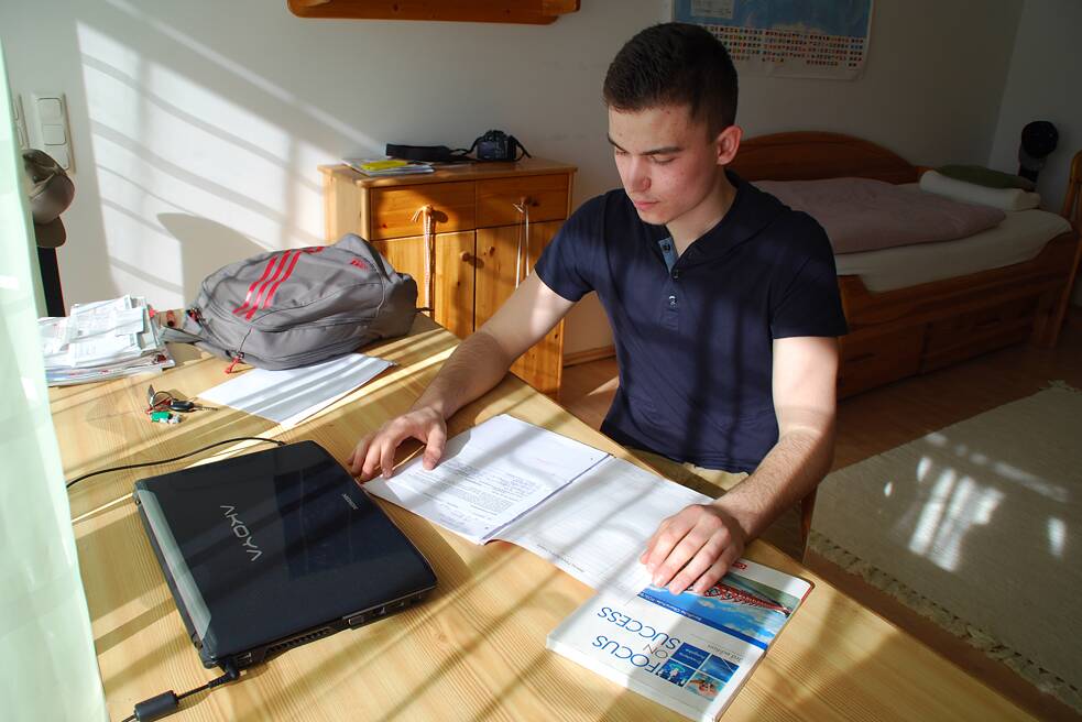 Mit 16 bin ich von zu Hause ausgezogen. Ich wohne in Landshut in einem Wohnheim. Es liegt direkt bei der Schule. Dort habe ich ein Zimmer mit Bad und einer kleinen Küche. Die Wohnung ist ungefähr 20 Quadratmeter groß. An der Wand hängen moderne Bilder und Poster von Bodybuildern. In Landshut habe ich einen eigenen Fernseher. Viele meiner Mitschüler wohnen im Wohnheim. Wir machen viel zusammen. Es gibt einen Gemeinschaftsraum. Wir haben Sportkurse, Billardtische und auch Musikinstrumente.